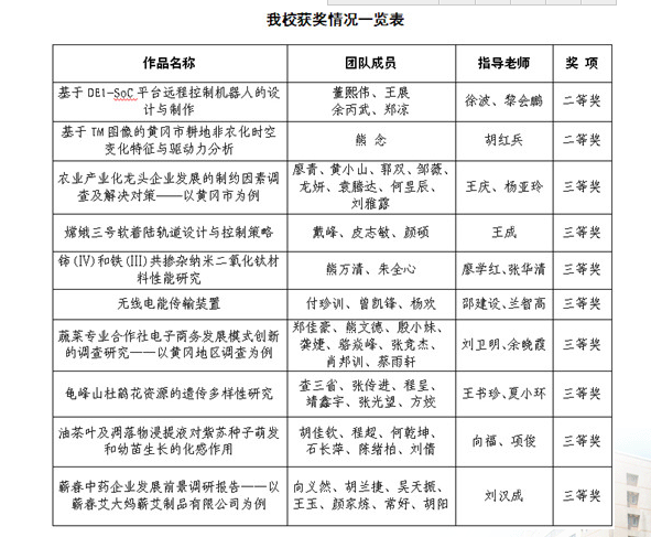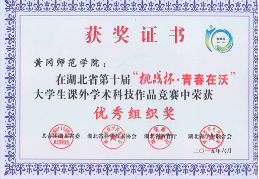 6月10日,湖北省第十届“挑战杯·青春在沃”大学生课外学术科技作品竞赛终审决赛和颁奖典礼在武汉工程大学举行,我校获得“优秀组织奖”,并获得二等奖2项、三等奖8项。