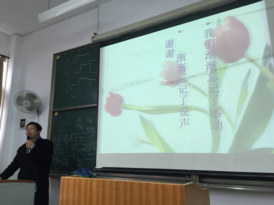 首先,江俊新老师强调感恩就是乐于把得到好处的感激呈现出来且回馈给他人,得到资助的同学首先应该学会感恩父母。从我们呱呱坠地时,父母对我们倾注了无数的爱,无论有多大的成就都不能忘记父母“汪洋”般的恩亲。于此同时我们还应感恩国家、感恩社会、感恩学校。感恩国家的大好政策对寒门子弟求学的大力支持和关爱,国家奖助学金不但能帮助我们减轻家庭负担,期望我们更好地生活和学习,增强信心,也使我们多了一股责任感。感恩社会给予我们的一切,感恩学校培养教育我们成人成才,感恩德高为师、身正为范的老师无私奉献的付出。其次胡老师给我们讲到,古人言勿以善小而不为,感恩就是从身边小事做起,勤奋努力,积极参加集体活动,加入积极有益的团体,不断增强个人修养与技能素质,以知识和实践充实自己的大学生活,来回报父母、回报国家、回报社会。告诫我们身处何时何地为人、为官、为人子女、做学者等千万不能没有感恩之心,不能唯利是图;并从微软副总和一位小职员的事例告诉我们报恩之心比什么都高尚,心怀感恩之心必定会有所回报,有着感恩的心是走向成功的基础 。接着,学生代表电科专业2013级李显春和耿凤霞的发言道出了同学们心声,积极参加活动,努力学习,学会感恩,不辜负学校和老师的期望学习好专业知识,争做新时代的弄潮儿。
