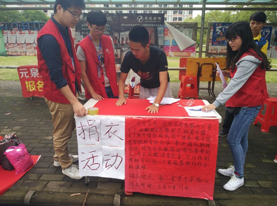 (通讯员:杨青松) 5月20日至5月22日,在学院的支持下,电信学院团委联手青协成功举办献爱心捐衣到家活动。活动从5月20日开始,电子信息学院分团委学生会经过认真安排后,在南区二食堂十字路口全天摆服务台向在校学生宣传捐衣活动。活动过程中,不仅是本院学生,更有很多其它学院特别是大四的学生纷纷捐出衣物,或联系我院学生会前去取走衣物。两天下来,捐助衣物整整装满了一汽车,包括冬衣和夏衣,鞋子等。最后,分团委学生会主要干部将衣物顺利送到了需要帮助的家庭,得到了当地群众的热烈欢迎和高度赞扬.