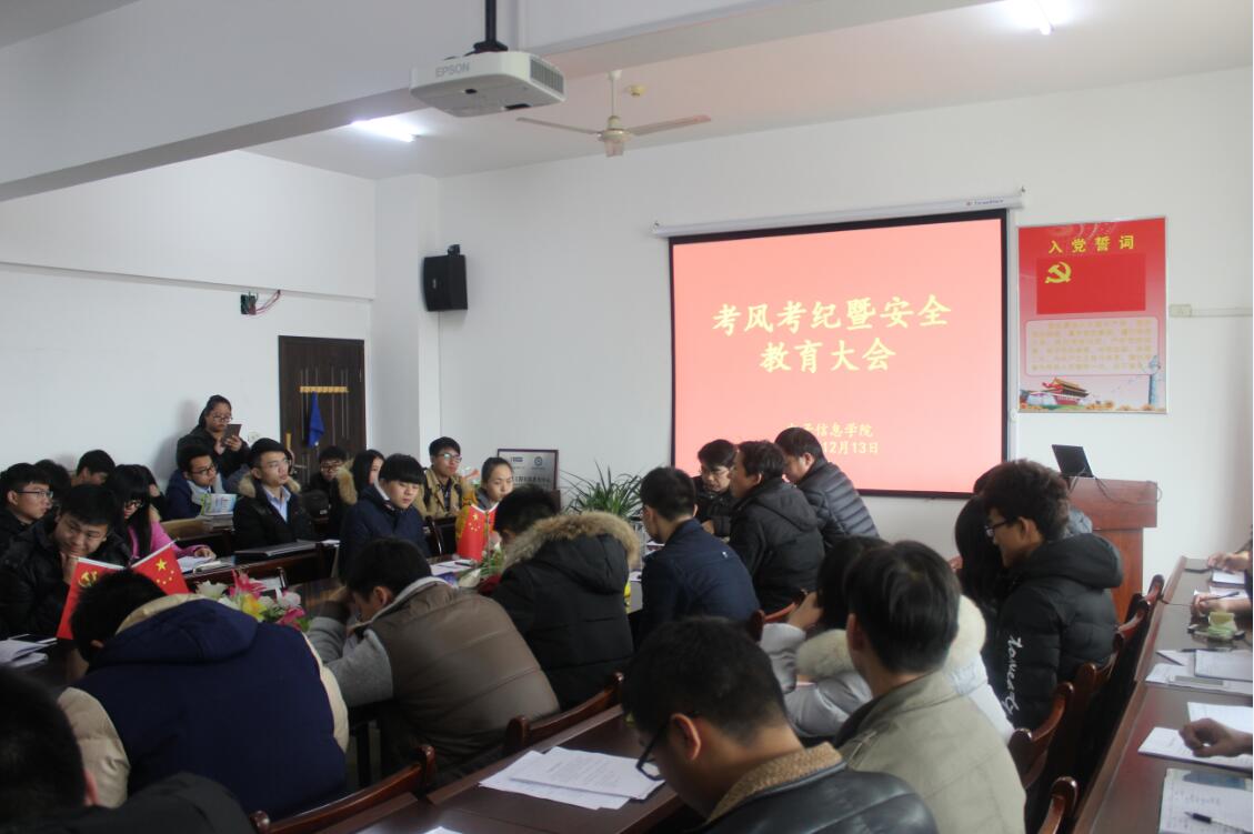 2016年12月13日中午,我院考风考纪暨安全教育大会在北区科技楼405会议室顺利召开。电子信息学院党总支副书记闵艳林,学工办主任江俊新,辅导员王巍,严丹以及全院各班班长、团支书参与此次会议。