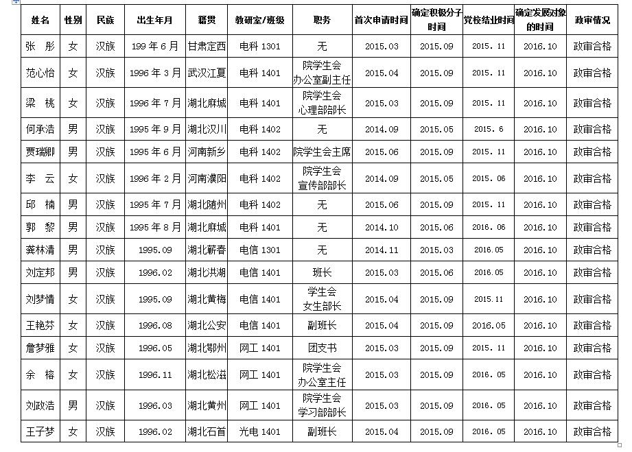 根据电子信息学院党总支部委员会2016年12月16日决定,拟于近期讨论接受张彤、范心怡等16位同志为中共预备党员,现将有关情况公示如下: