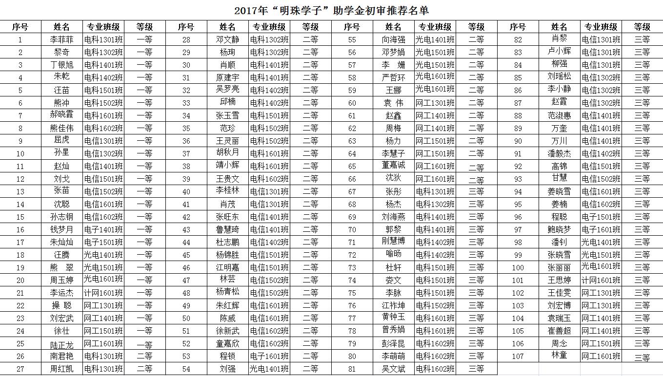 经学生本人申请,班级民主评议推评,学院评审推荐工作领导小组(由学院领导、年级辅导员、各年级班主任代表和学生代表组成)审核各班推评材料,召开全院评审推荐会议集体讨论,确定了2017年“明珠学子”助学金的获助学生初审名单,现将初审结果公示如下:
