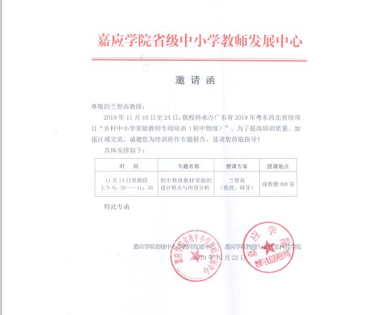 上午,兰教授为2019年广东省乡村物理实验教师做了专题报告“初中物理教材实验的设计特点与内容分析”。兰智高教授从学校办学历程“源于师范”“兴于师范”“强于师范”三个阶段切入,详细介绍了黄冈师范学院的百年师范办学特色;从跨学科研究视角,深入讲解了物理学及研究内容的变化和科学研究范式 ;从比较研究研究视角,对人教版八、九年级物理教材实验内容进行了分析;从系统理论、传播理论、学习理论与教学设计的关联入手,解读了初中物理实验设计特点。报告中,引入了丰富的案例、个人的教科研成果、心得,与33名学员进行了互动,学员反映大有收获。嘉应学院副院长张恩德教授陪同。在交流期间,遇到了国家课程标准研制专家华东师范大学胡炳元教授,与胡教授进行了深入的交流。