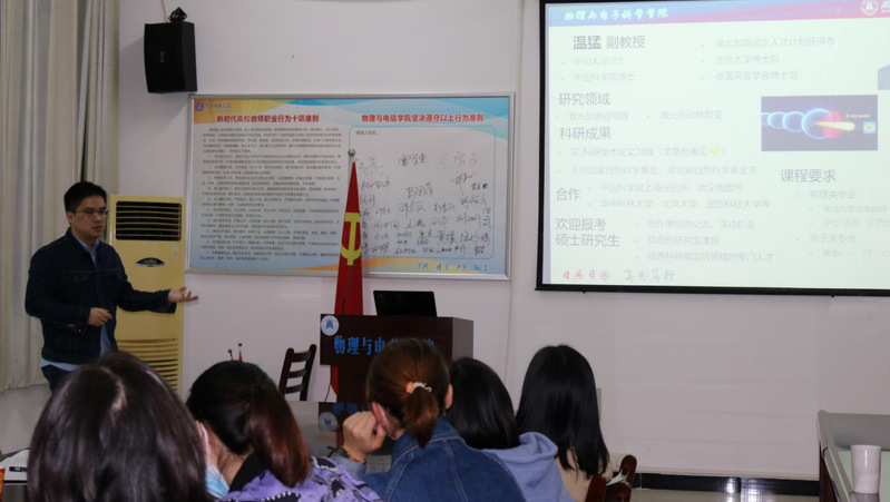 在讲座之后,丁益明主任和彭小牛副主任对我院大三、大四学子进行考研指导,详细介绍了湖北大学物理与电子科学星空官方网页版、师资条件、招生简章和奖助学金政策。