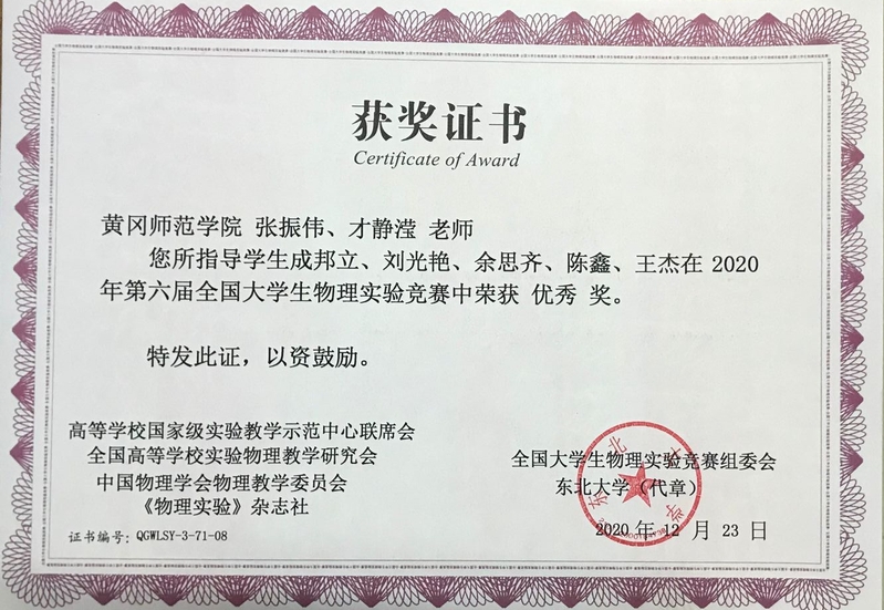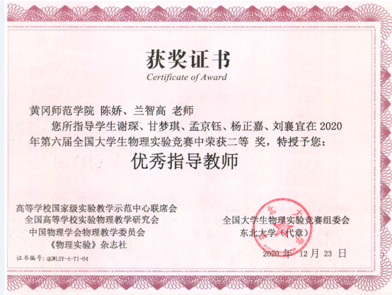 物理与电信学院高度重视大学物理实验竞赛工作,按照师范专业认证对学生教学技能的具体要求,强化大学生技能训练组织领导,学院成立了专班,组织了一、二、三级25名同学参与的跨年级5支竞赛团队,每队学生在2名教师的指导下,进行了为期2个多月的强化训练,按照组委会的技术标准,提交了视频文件和参与线上答辩。最终,谢琛、童钊、徐健、李中豪等为代表的四支参赛队伍获得二等奖;杨昌权、王小兰、兰智高、陈娇、龚沙、刘华忠等六位教师被评为本次竞赛的优秀指导教师;学校被评为优秀组织单位。
