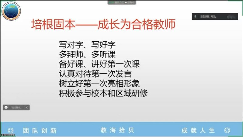 王性宇指出,培根固本才能成为合格教师,要做好六件事:一是写好字,写对字;二是多拜师,多听课;三是备好课,讲好第一次课;四是认真对待第一次发言;五是树立好第一次亮相形象;六是积极参与校本和区域研修。着重强调了集体备课要做到:八点、六有和四个意识。