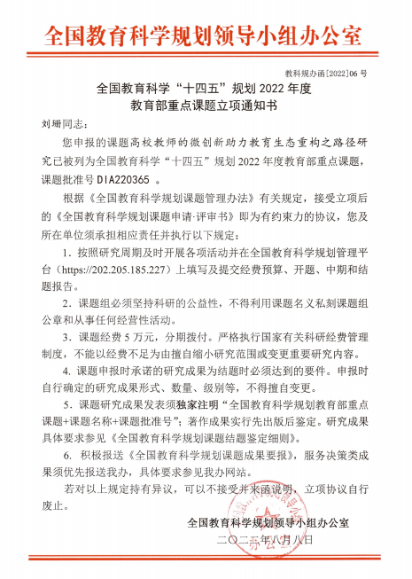 刘珊副教授课题组主持的课题以高校教师微创新、微认证为切入点,聚焦“智慧教育”背景下的教师专业成长和教育生态重构,进而为新时期高校教育现代化提供可供借鉴的范本案例。选题具有较强的现实意义和一定的理论价值。针对高等学校教师专业发展动力不足、“智慧教育”发展滞后的问题,课题提出了“微创新”、“微认证”的思路,并建构了一套促进教师专业发展的“微认证”体系,旨在探索“智慧教育”背景下高校教师专业成长和教育生态重塑的实践路径,形成了理论逻辑和实践逻辑上的自洽,为课题的深入研究奠定了较好的基础。