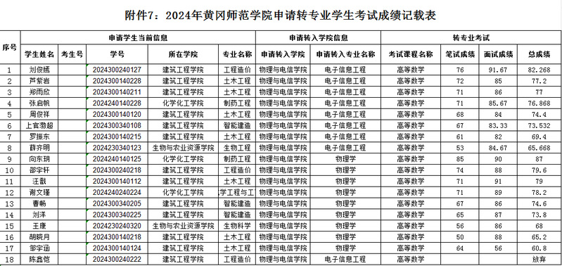 2024年黄冈师范学院申请转专业学生考试成绩公示