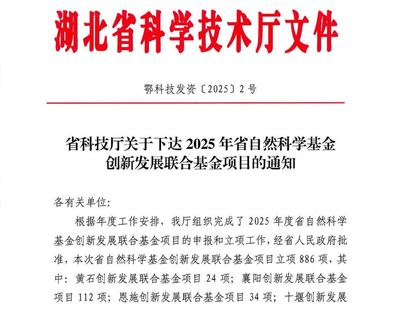近日,根据《省科技厅关于下达2025年省自然科学基金创新发展联合基金项目的通知》(鄂科技发资〔2025〕2号),物理与电信学院传来喜讯,成功获批2项省自然科学基金创新发展联合基金项目。这标志着学院在科学研究和创新能力方面取得了新的突破,为学院的科研发展注入了新的活力。